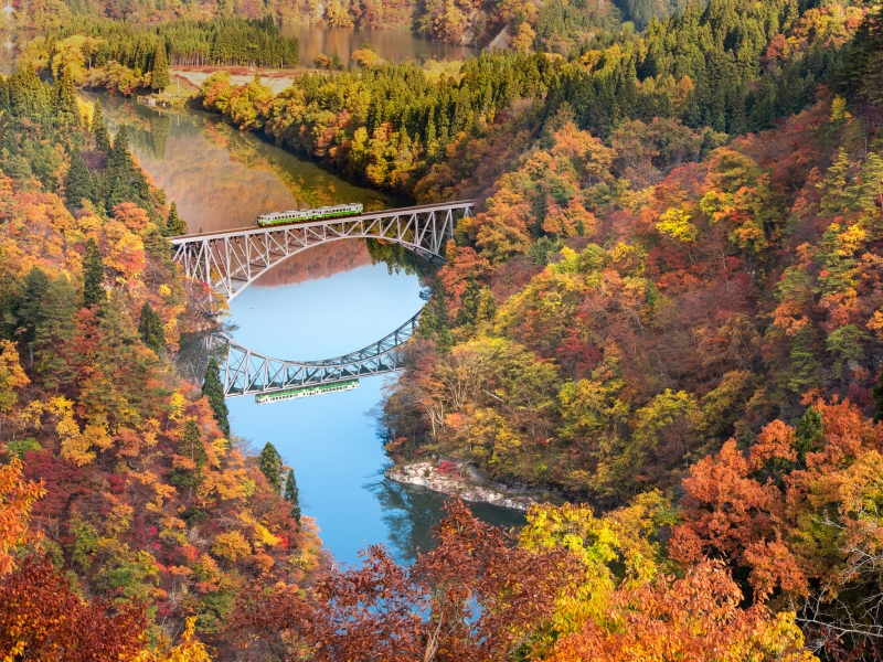 紅葉に彩られた山間を進む JR 只見線の列車です。