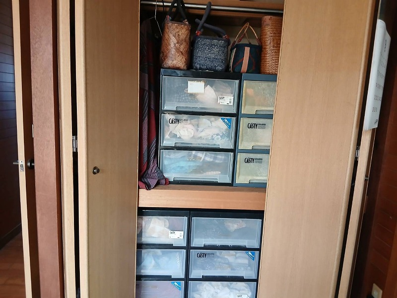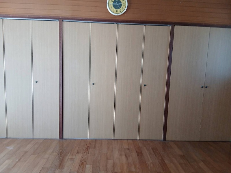 わが家は木製の扉でタンスはありません。 2階3階の扉です。 洋服は主人がパイプを作ってくれましたので吊るしています。 奥行があるので布団の収納も出来ます。