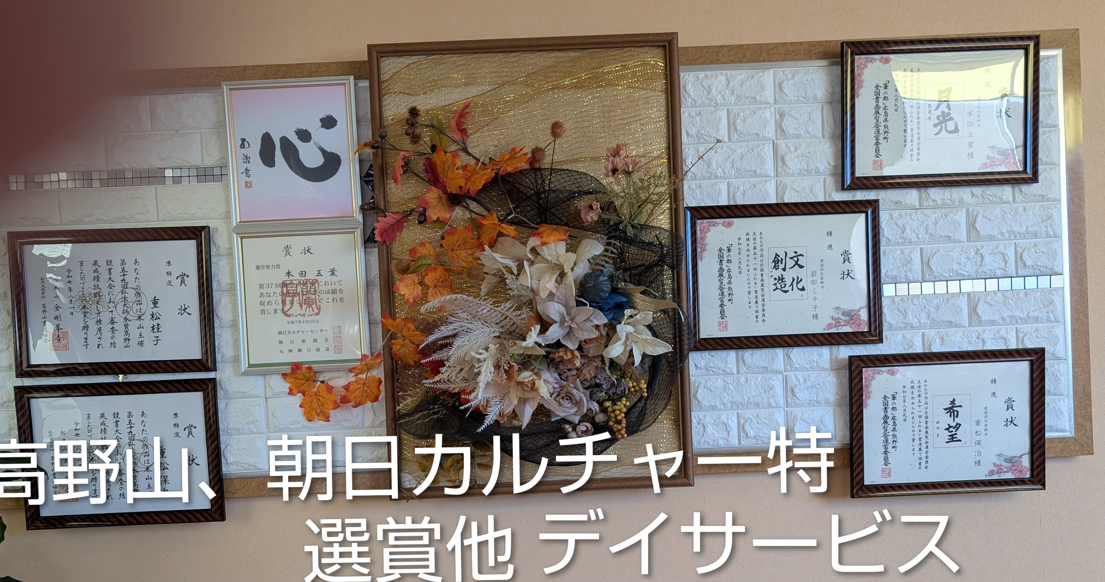 デイサービスでは書道教室入賞展示して下さり年寄り笑顔です