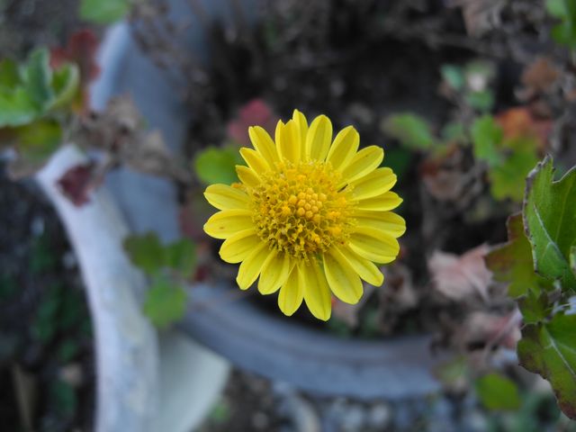鉢植えの小さな黄色のキク 少しだけ咲いています。