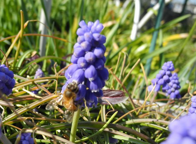 今が盛りのムスカリ プランターは片手で持ち上げられないので