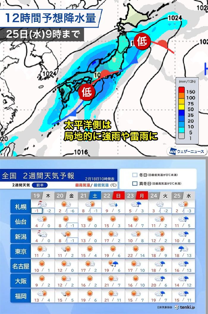 この先2月15日(日)から2月27日(金)は、太平洋側では晴れて暖かい日が多いようです。
