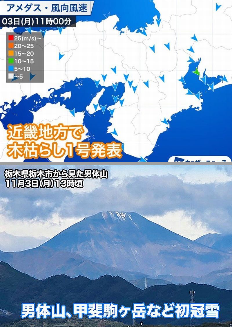 近畿では北寄りの風が強まり、大阪管区気象台は、木枯らし1号が吹いたと発表しました。
