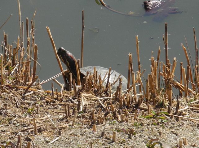 近くの調整池にアカミミガメ(ミドリガメ)がいました。