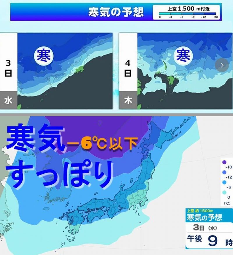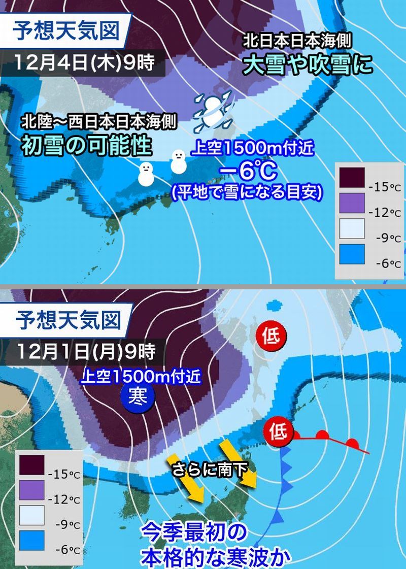 12月1日(月) 正午: -6℃線は北海道付近に留まっています。 12月3日(水) 正午: 寒気が一気に南下。-6℃線は本州のほぼ全域を覆い尽くし、冷え込みが本格化します。 この急激な気温低下により、日本列島は真冬並みの寒気に覆わる見込みのようです。
