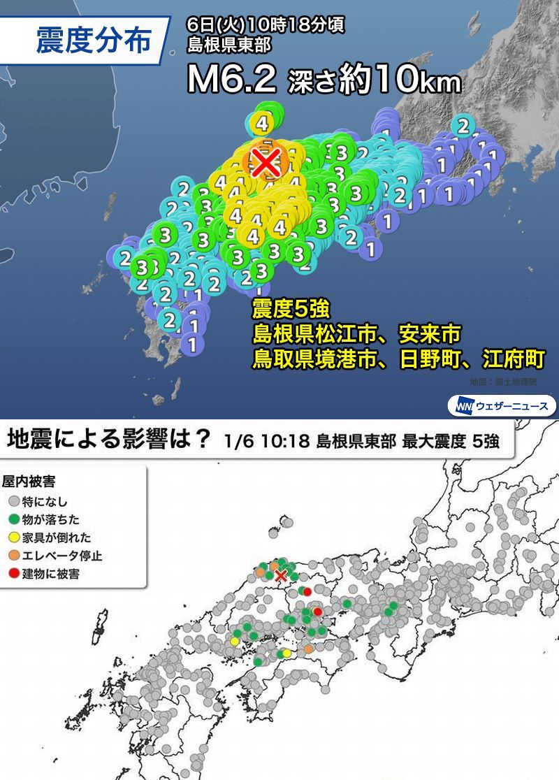 昨日6日(火)10時過ぎに島根県東部を震源とするマグニチュード6.2の地震が発生し、 島根県と鳥取県で最大震度5強を観測しました。 震源が浅く、今後も強い揺れを伴う地震が続くおそれがあるため、警戒が必要です、 宝塚も震度3で、びっくりしました。