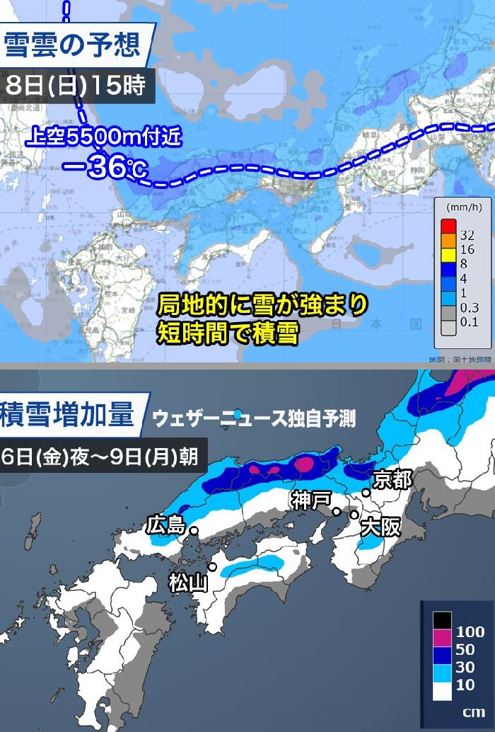 非常に強い寒気が南下する影響で、8日(日)は大阪市や神戸市・宝塚など関西エリアや四国、山陽なども積雪の恐れがでてきました。