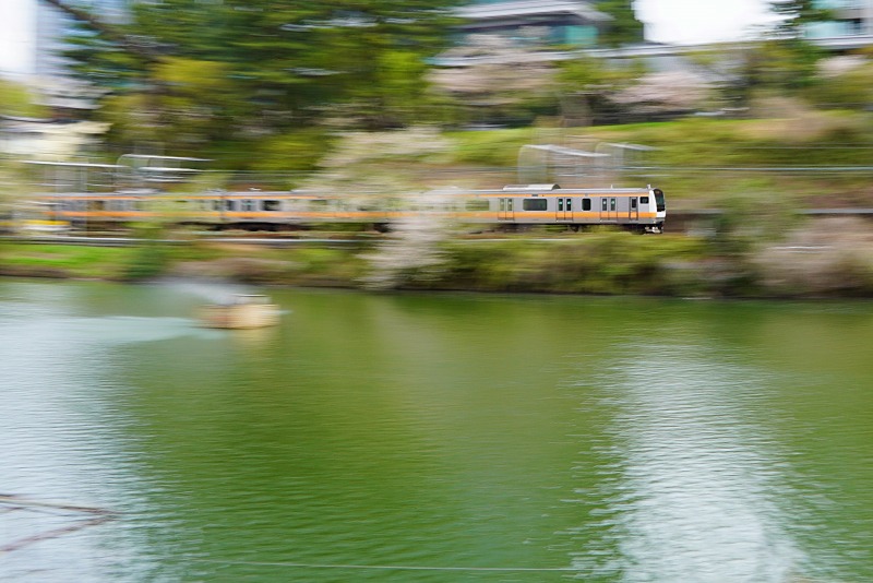 飯田橋でお濠の桜と電車を流し撮りしました。