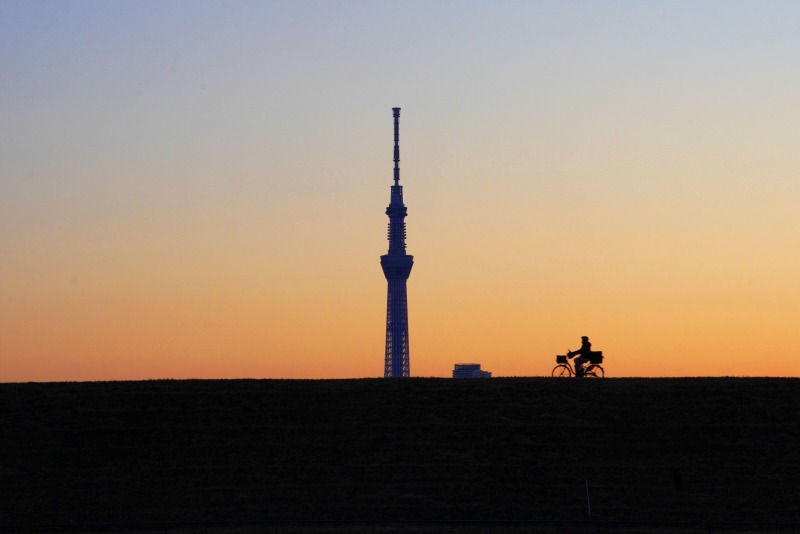 夕焼けの土手を行き来する人を撮りました。