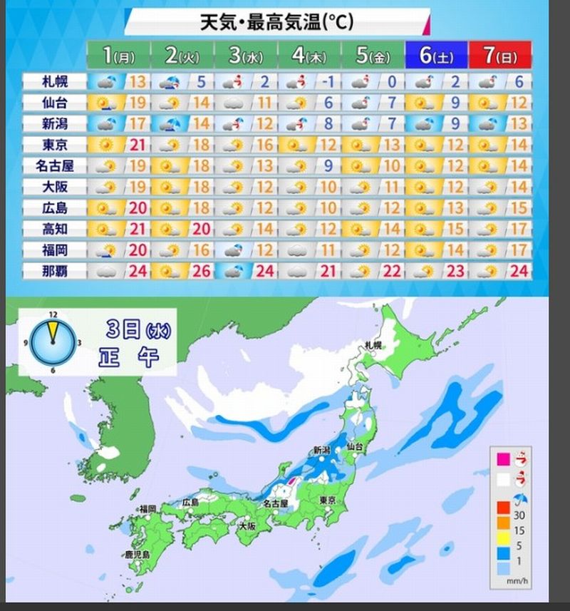 ・来週後半は全国的に平年より寒いの予想が出ています。