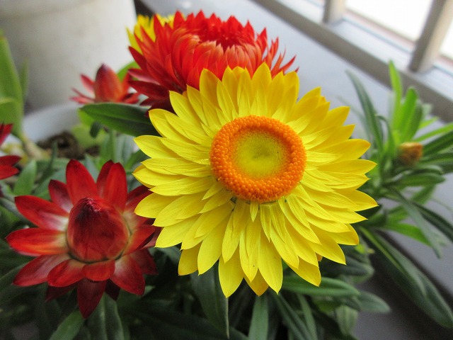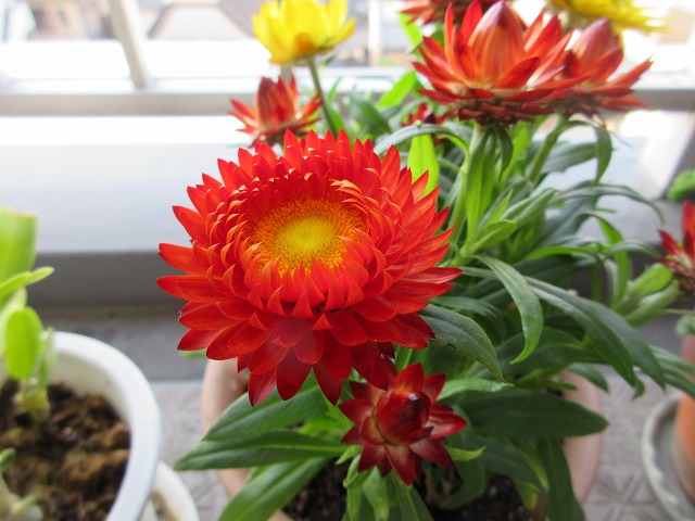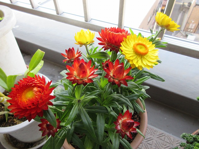この花は、ヘリクリサムと言って、さわると花びらがパリパリとして硬いんですよ。気温が下がるとしぼみます。上がると開きます。