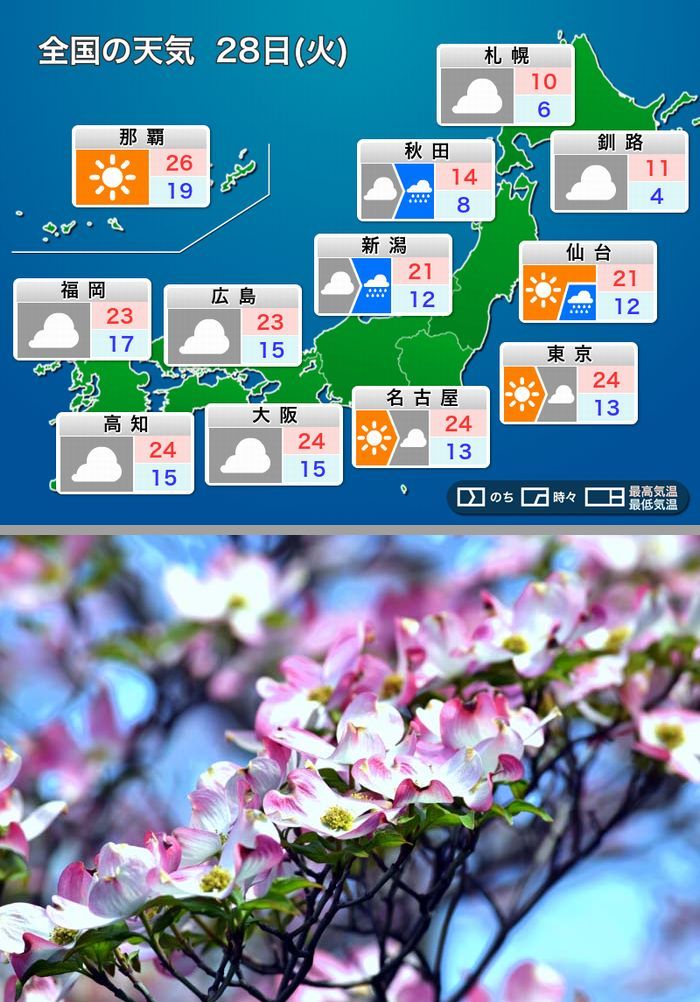 雨で、気温は大幅ダウンの予想です、最高気温が17Cしか上がらないようです。